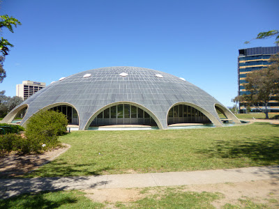 through of the school on Saturday afternoon. Rod picked us up in his rental car a bit ahead of time so we could visit a few familiar spots around town. Our first stop was the new medical school building at the Australian National University, where Gauss's father had worked. This was en route to the Australian Academy of Sciences, a building commonly referred to as the "Martian Embassy." Canberra has a reputation for cutting edge architecture, so we had to photograph the structure.